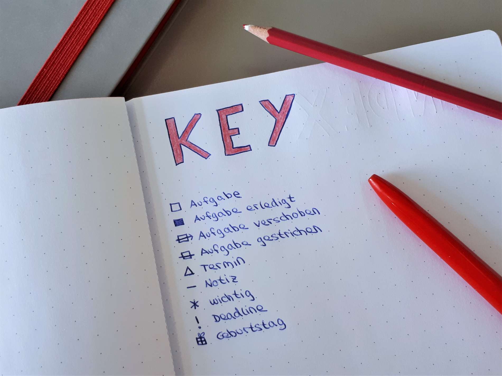 Auf der ersten Seite des Bullet Journals wird die Legende dargestellt. Symbole, Zeichen und Farben, die im Bullet Journal verwendet werden, werden aufgelistet und die entsprechende Bedeutung wird dahinter geschrieben, z.B. Aufgabe, Aufgabe erledigt, Aufgabe verschoben, Termin und Priorität. Am besten wählt man Symbole, die für einen selbst stimmig und intuitiv sind.