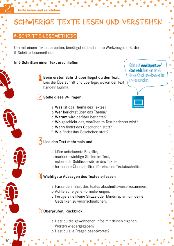Schwierige Texte lesen und verstehen 5 Schritte Lesemethode Um mit einem Text zu arbeiten benötigst du bestimmte Werkzeuge z B die 5 Schritte Lesemethode In 5 Schritten einen Text erschließen Beim ersten Schritt überfliegst du den Text Lies die Überschrift und überlege wovon der Text handeln könnte Stelle diese W Fragen a Was ist das Thema des Textes b Wer berichtet über das Thema c Warum wird darüber berichtet d Wo geschieht das worüber im Text berichtet wird e Wann findet das Geschehen statt f Wie findet das Geschehen statt Lies den Text mehrmals und a kläre unbekannte Begriffe b markiere wichtige Stellen im Text c notiere dir Schlüsselwörter des Textes d formuliere Überschriften für einzelne Textabschnitte Wichtigste Aussagen des Textes erfassen a Fasse den Inhalt des Textes abschnittsweise zusammen b Achte auf eigene Formulierungen c Fertige eine kleine Skizze oder Mindmap an um deine Gedanken zu veranschaulichen Überprüfen Rückblick a Hast du die gewonnenen Infos mit deinen eigenen Worten wiedergegeben b Hast du alle Fragen beantwortet Gehe auf www kapiert de downloads hier kannst du dir die Checkliste downloaden und ausdrucken 10 Texte lesen und verstehen