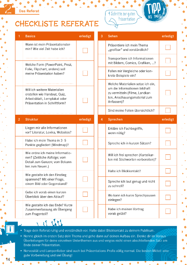 Checkliste Referate 1 Basics erledigt Wann ist mein Präsentationster min Wie viel Zeit habe ich Welche Form PowerPoint Prezi Folie Flipchart andere soll meine Präsentation haben Will ich weitere Materialien erstellen wie Handout Quiz Arbeitsblatt Lernplakat oder Präsentation in Schriftform 2 Struktur erledigt Liegen mir alle Informationen vor Literatur Lexika Websites Habe ich mein Thema in 3 5 Punkte gegliedert Mindmap Wie ordne ich meine Informatio nen Zeitliche Abfolge vom Detail zum Ganzen vom Bekann ten zum Neuen Wie gestalte ich den Einstieg spannend Mit einer Frage einem Bild oder Gegenstand Gebe ich vorab einen kurzen Überblick über den Ablauf Wie gestalte ich das Ende Kurze Zusammenfassung als Übergang zum Fragenteil Tipp des Tages 4 Schritte zur guten Präsentation Trage dein Referat ruhig und verständlich vor Halte dabei Blickkontakt zu deinem Publikum Nenne gleich im ersten Satz dein Thema und gehe dann auf deinen Aufbau ein Denke dir im Voraus Überleitungen für deine einzelnen Unterthemen aus und vergiss nicht einen abschließenden Satz am Ende deiner Präsentation Nervosität und Lampenfieber sind auch bei Präsentations Profis völlig normal Die besten Mittel eine gute Vorbereitung und viel Übung 3 Sehen erledigt Präsentiere ich mein Thema greifbar und verständlich Transportiere ich Informationen mit Bildern Comics Grafiken Fallen mir Vergleiche oder kon krete Beispiele ein Welche Materialien setze ich ein um die Informationen bildhaft zu vermitteln Filme Landkar ten Anschauungsmaterial zum Anfassen Sind meine Folien übersichtlich 4 Sprechen erledigt Erkläre ich Fachbegriffe wenn nötig Spreche ich in kurzen Sätzen Will ich frei sprechen Karteikar ten mit Stichworten vorbereiten Halte ich Blickkontakt Spreche ich laut genug und nicht zu schnell Wo kann ich kurze Sprechpausen einlegen Habe ich meinen Vortrag vorab geübt 14 Das Referat