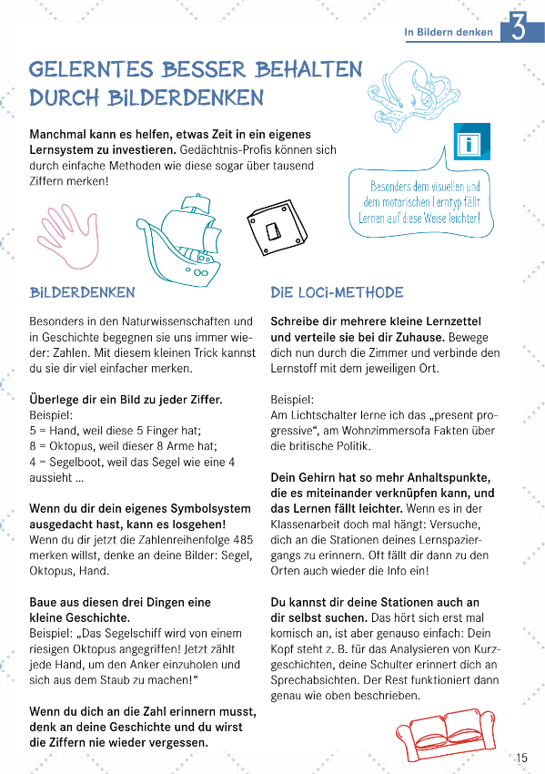 Gelerntes besser behalten durch Bilderdenken Bilderdenken Die Loci Methode Besonders dem visuellen und dem motorischen Lerntyp fällt Lernen auf diese Weise leichter Manchmal kann es helfen etwas Zeit in ein eigenes Lernsystem zu investieren Gedächtnis Profis können sich durch einfache Methoden wie diese sogar über tausend Ziffern merken Besonders in den Naturwissenschaften und in Geschichte begegnen sie uns immer wie der Zahlen Mit diesem kleinen Trick kannst du sie dir viel einfacher merken Überlege dir ein Bild zu jeder Ziffer Beispiel 5 Hand weil diese 5 Finger hat 8 Oktopus weil dieser 8 Arme hat 4 Segelboot weil das Segel wie eine 4 aussieht Wenn du dir dein eigenes Symbolsystem ausgedacht hast kann es losgehen Wenn du dir jetzt die Zahlenreihenfolge 485 merken willst denke an deine Bilder Segel Oktopus Hand Baue aus diesen drei Dingen eine kleine Geschichte Beispiel Das Segelschiff wird von einem riesigen Oktopus angegriffen Jetzt zählt jede Hand um den Anker einzuholen und sich aus dem Staub zu machen Wenn du dich an die Zahl erinnern musst denk an deine Geschichte und du wirst die Ziffern nie wieder vergessen Schreibe dir mehrere kleine Lernzettel und verteile sie bei dir Zuhause Bewege dich nun durch die Zimmer und verbinde den Lernstoff mit dem jeweiligen Ort Beispiel Am Lichtschalter lerne ich das present pro gressive am Wohnzimmersofa Fakten über die britische Politik Dein Gehirn hat so mehr Anhaltspunkte die es miteinander verknüpfen kann und das Lernen fällt leichter Wenn es in der Klassenarbeit doch mal hängt Versuche dich an die Stationen deines Lernspazier gangs zu erinnern Oft fällt dir dann zu den Orten auch wieder die Info ein Du kannst dir deine Stationen auch an dir selbst suchen Das hört sich erst mal komisch an ist aber genauso einfach Dein Kopf steht z B für das Analysieren von Kurz geschichten deine Schulter erinnert dich an Sprechabsichten Der Rest funktioniert dann genau wie oben beschrieben 15 In Bildern denken