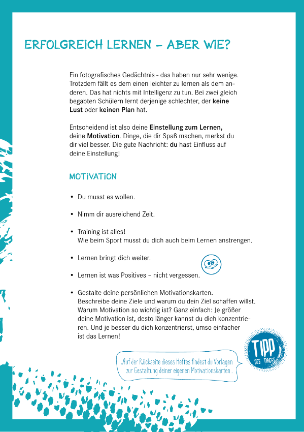 Erfolgreich lernen aber wie Ein fotografisches Gedächtnis das haben nur sehr wenige Trotzdem fällt es dem einen leichter zu lernen als dem an deren Das hat nichts mit Intelligenz zu tun Bei zwei gleich begabten Schülern lernt derjenige schlechter der keine Lust oder keinen Plan hat Entscheidend ist also deine Einstellung zum Lernen deine Motivation Dinge die dir Spaß machen merkst du dir viel besser Die gute Nachricht du hast Einfluss auf deine Einstellung Motivation Du musst es wollen Nimm dir ausreichend Zeit Training ist alles Wie beim Sport musst du dich auch beim Lernen anstrengen Lernen bringt dich weiter Lernen ist was Positives nicht vergessen Gestalte deine persönlichen Motivationskarten Beschreibe deine Ziele und warum du dein Ziel schaffen willst Warum Motivation so wichtig ist Ganz einfach Je größer deine Motivation ist desto länger kannst du dich konzentrie ren Und je besser du dich konzentrierst umso einfacher ist das Lernen Auf der Rückseite dieses Heftes findest du Vorlagen zur Gestaltung deiner eigenen Motivationskarten Tipp des Tages
