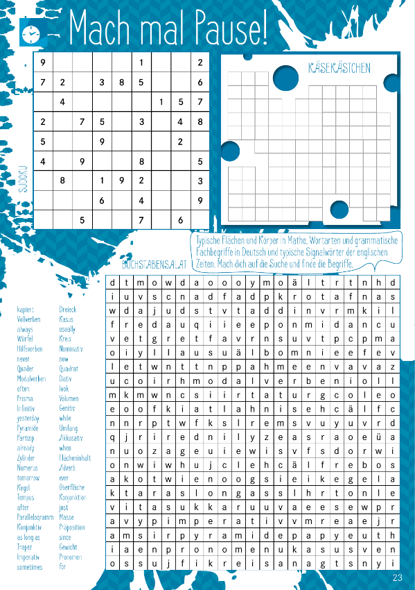 97 2 4 3 1 8 5 5 6 5 9 7 4 9 8 1 2 2 5 8 5 3 9 67 4 291 6 8 5 7 4 2 3 SU DO KU BUCHSTABENSALAT Typische Flächen und Körper in Mathe Wortarten und grammatische Fachbegriffe in Deutsch und typische Signalwörter der englischen Zeiten Mach dich auf die Suche und finde die Begriffe kapiert Vollverben always Würfel Hilfsverben never Quader Modalverben often Prisma Infinitiv yesterday Pyramide Partizip already Zylinder Numerus tomorrow Kegel Tempus after Parallelogramm Konjunktiv as long as Trapez Imperativ sometimes Dreieck Kasus usually Kreis Nominativ now Quadrat Dativ look Volumen Genitiv while Umfang Akkusativ when Flächeninhalt Adverb ever Oberfläche Konjunktion just Masse Präposition since Gewicht Pronomen for Mach mal Pause d t m o w d a o o o y m o ä l t r t n h d i u v s c n a d f a d p k r o t a f n a s w d a j u d s t v t a d d i n v r m k i l f r e d a u q i i e e p o n m i d a n c u v e t g r e t f a v r n s u v t p c p m a o i y l l a u s u ä l b o m n i e e f e v l e t w n t t n p p a h m e e n v a v a z u c o i r h m o d a l v e r b e n i o l l m k m w n c s i i r t a t u r g c o l e o e o o f k i a t l a h n i s e h c ä l f c n n r p t w f k s l r e m s v u y u v r d q j r i r e d n i l y z e a s r a o e ü a n u o z a g e u i e w i s v f s d o r w i o n w i w h u j c l e h c ä l f r e b o s a k o t w i e n o o g s i e i k e g e l a k t a r a s l o n g a s s l h r t o n l e v i t a s u k k a r u u v a e e s e w p r a v y p i m p e r a t i v v m r e a e j r a m s i r p y r a m i d e p a p y e u t h i a e n p r o n o m e n u k a s u s v e n o s s u j f i k r e i s a n a g t s n y i KäSEKäSTCHEN 23