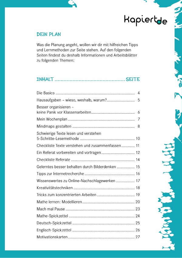 Dein Plan Was die Planung angeht wollen wir dir mit hilfreichen Tipps und Lernmethoden zur Seite stehen Auf den folgenden Seiten findest du deshalb Informationen und Arbeitsblätter zu folgenden Themen Inhalt Seite Die Basics 4 Hausaufgaben wieso weshalb warum 5 Besser organisieren keine Panik vor Klassenarbeiten 6 Mein Wochenplan 7 Mindmaps gestalten 8 Schwierige Texte lesen und verstehen 5 Schritte Lesemethode 10 Checkliste Texte verstehen und zusammenfassen 11 Ein Referat vorbereiten und vortragen 12 Checkliste Referate 14 Gelerntes besser behalten durch Bilderdenken 15 Tipps zur Internetrecherche 16 Wissenswertes zu Online Nachschlagewerken 17 Kreativitätstechniken 18 Tricks zum konzentrierten Arbeiten 19 Mathe lernen Modellieren 20 Mach mal Pause 23 Mathe Spickzettel 24 Deutsch Spickzettel 25 Englisch Spickzettel 26 Motivationskarten 27
