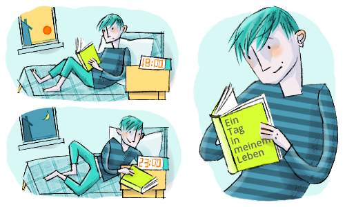 Schau dir einmal die Illustration an. Hast du eine Idee, worin der Unterschied zwischen erzählter Zeit und Erzählzeit liegen könnte?