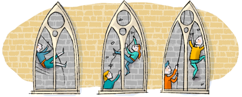 Er ging an die Kletterwand, griff mit seiner linken Hand den ersten Kletterstein, stellte den linken Fuß auf den untersten Stein, setzte den rechten Fuß auf einen höher gelegenen Kletterstein …