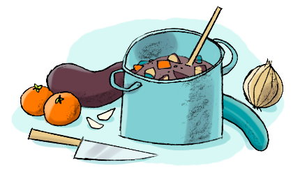 Milena und Anton essen Ratatouille, zubereitet mit verschiedenen Gemüsesorten, sehr gern.