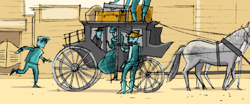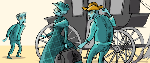 Die Körpersprache der gezeigten Figuren ist zu erkennen, nicht jedoch ihre Mimik. Von der Umgebung ist nur ein Teil zu sehen.