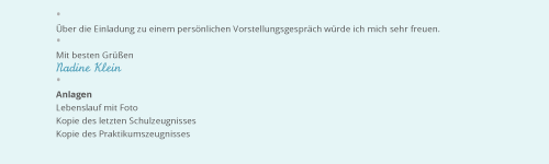 Am Schluss deines Schreibens stehen die Bitte nach einem persönlichen Gespräch, eine höfliche Grußformel und die Auflistung der Anlagen, die deiner Bewerbung beigefügt sind.