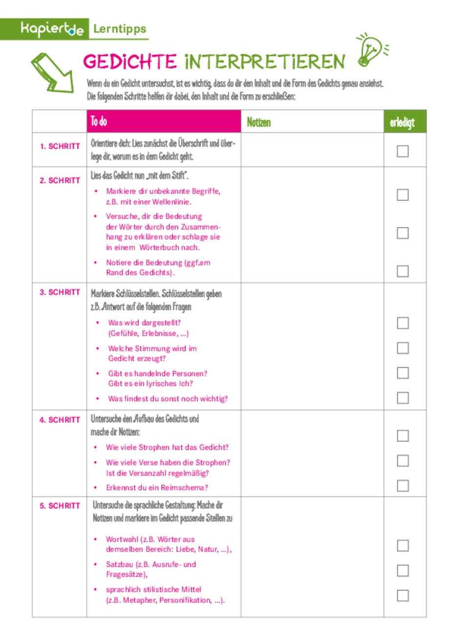 Wir helfen dir dabei. Wenn du ein Gedicht untersuchst, ist es wichtig, dass du dir den Inhalt und die Form des Gedichts genau ansiehst. Die 9 Schritte der Checkliste Gedichte interpretieren helfen dir, den Inhalt und die Form des Gedichts ganz einfach zu erschließen und eine vollständige Interpretation zu schreiben.