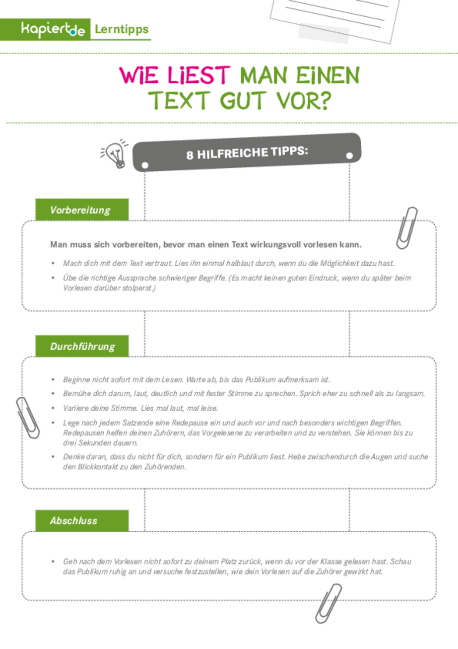 Mit dem Arbeitsblatt von kapiert.de kann beim nächsten Vorlesen nichts mehr schief gehen und du musst keine Angst davor haben dich zu blamieren.