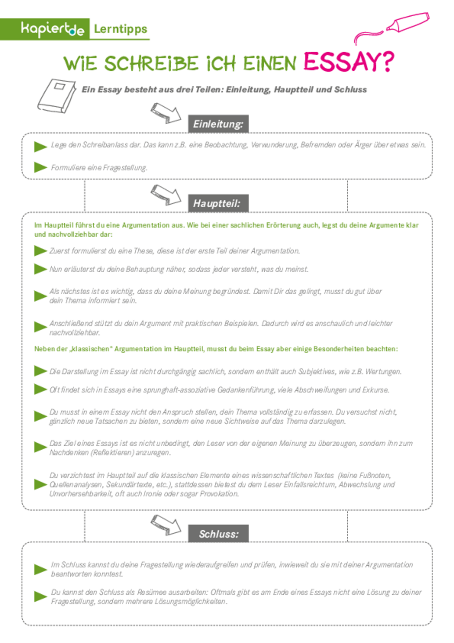 Wenn du einen Essay schreibst, dann setzt du dich mit einer Fragestellung zu einem bestimmten Thema auseinander und beurteilst sie mit deiner eigenen Meinung.