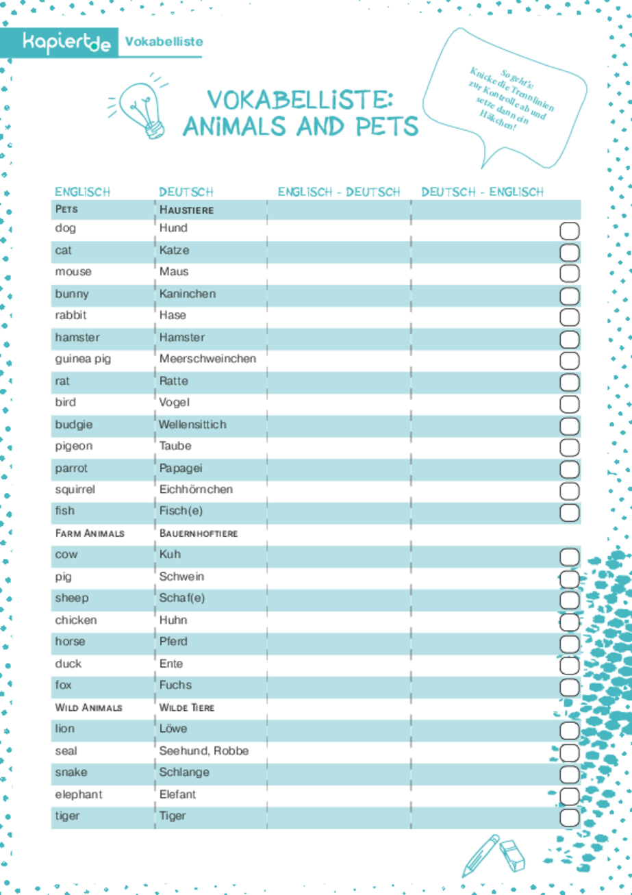 Vokabelliste: Animals and Pets