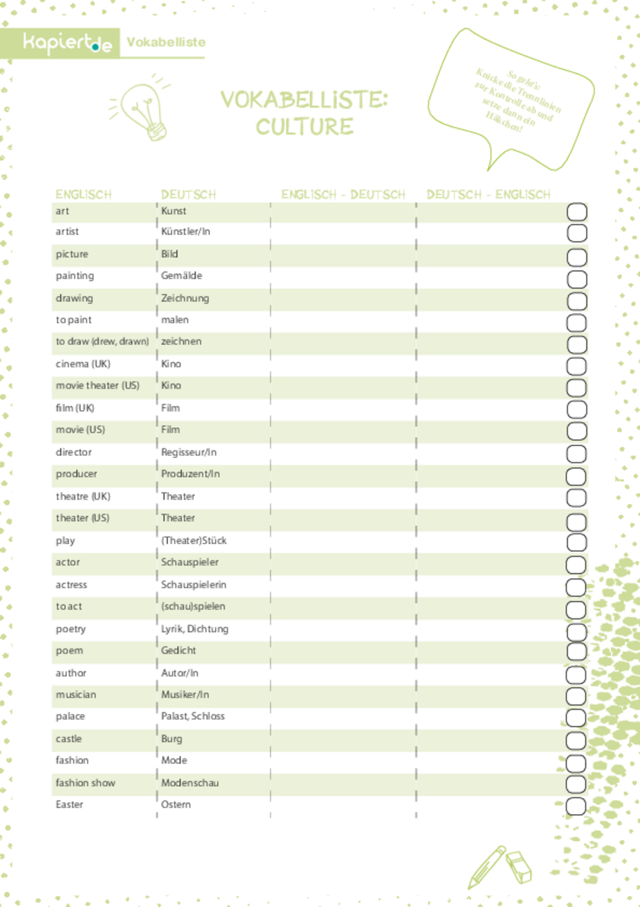Damit dir das nicht so leicht passiert, haben wir hier eine Vokabelliste zusammengestellt, mit der du ganz schnell und einfach deinen Wortschatz auf Englisch um einige Vokabeln zum Thema "Culture" erweitern kannst!