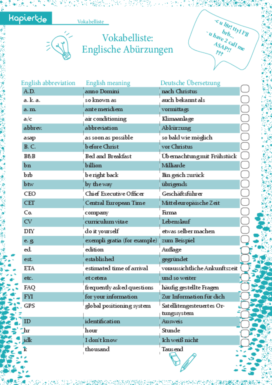 Kennt ihr das? Ihr seid in Eile, müsst aber schnell noch eine Nachricht verschicken? Ihr wartet schon ewig auf eure Freunde und bekommt als Nachricht nur Buchstabensalat? Ganz klar, Abkürzungen erleichtern uns das Texten, können aber auch schnell für Verwirrung sorgen! Hier haben wir für euch alle wichtigen, englischen Abkürzungen in einer praktischen Vokabelliste zusammengestellt.