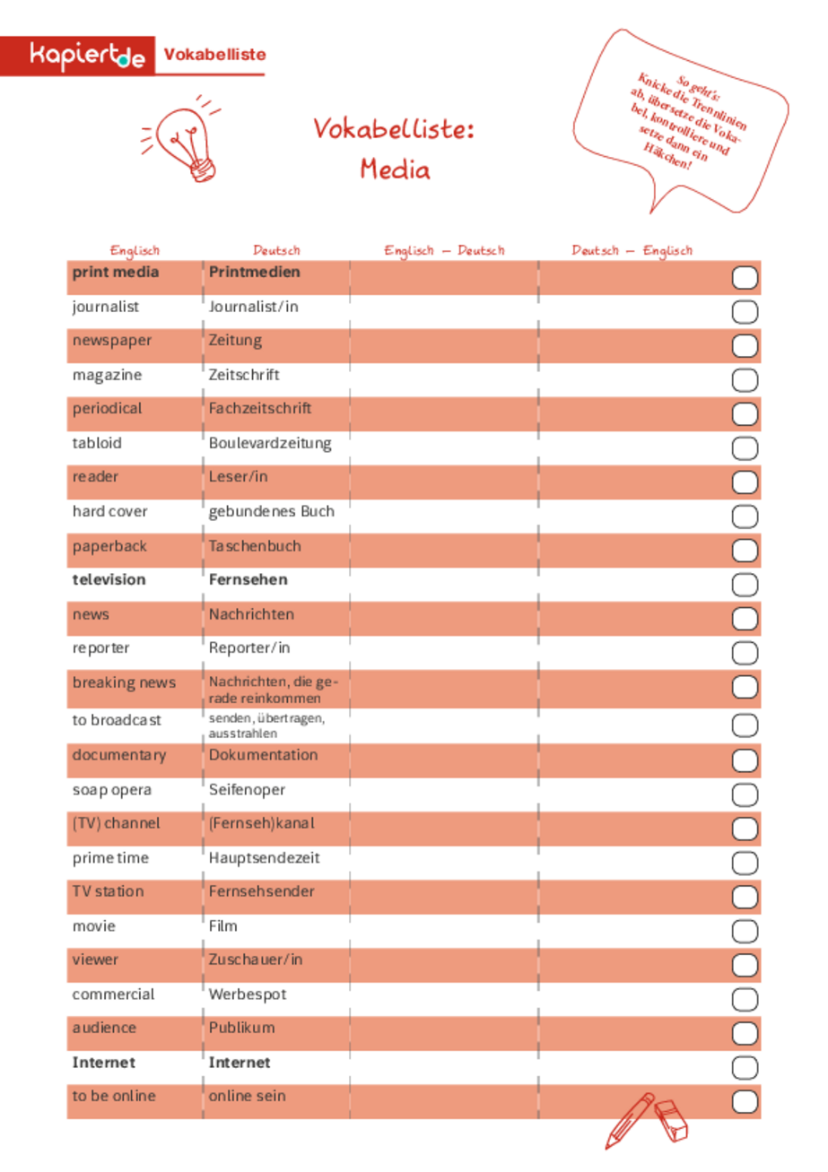 Damit dir das nicht so leicht passiert, haben wir hier eine Vokabelliste zusammengestellt, mit der du ganz schnell und einfach deinen Wortschatz auf Englisch um einige Vokabeln zum Thema "Media" erweitern kannst!