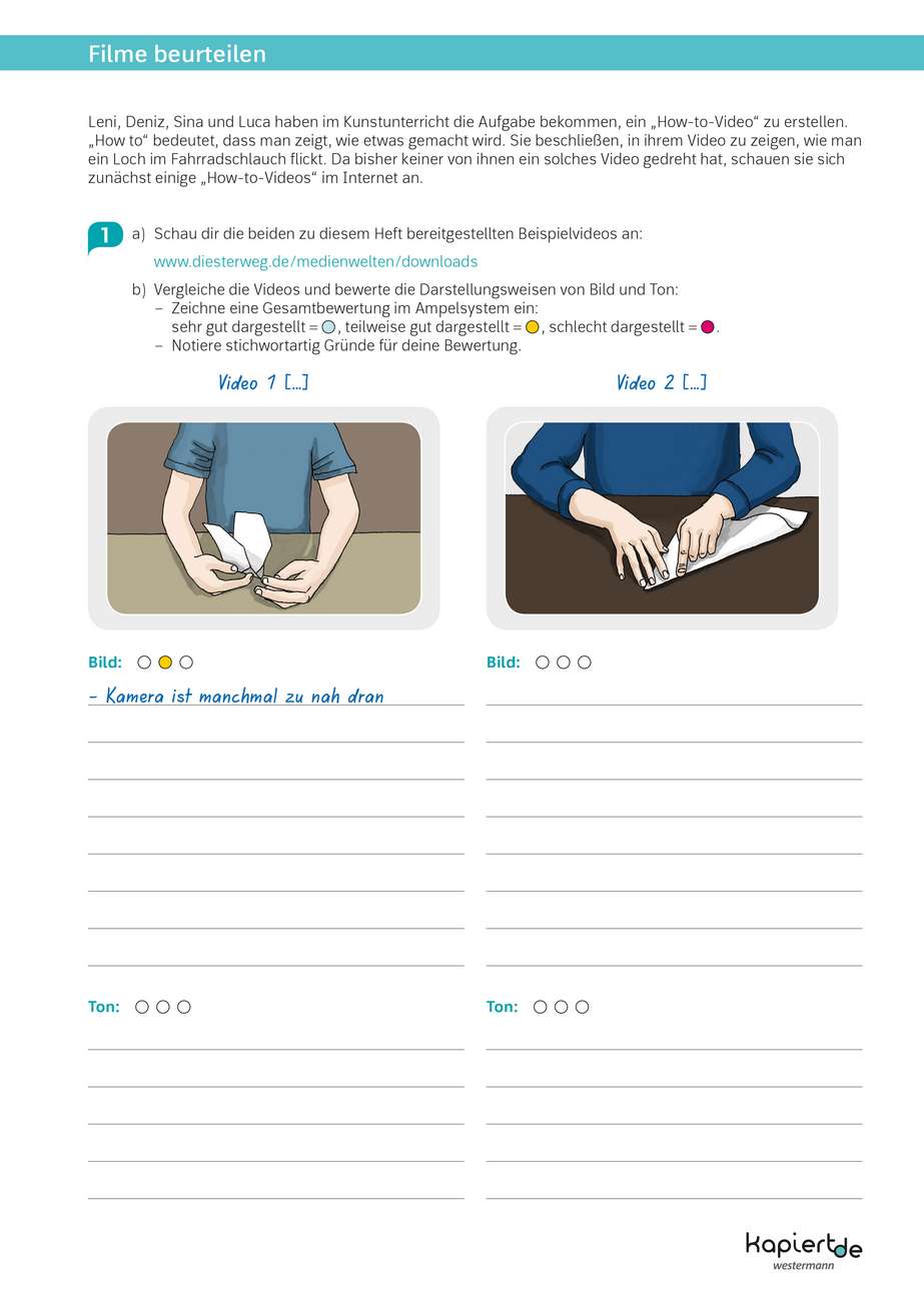 Auf diesem Arbeitsblatt beurteilen und vergleichen die Schülerinnen und Schüler anhand von Beispielen die Ton- und Bildebene von kurzen Videoclips. Zusätzlich erkennen sie an Bildern Probleme mit der Aufnahme und geben anschließend Tipps zur Verbesserung.