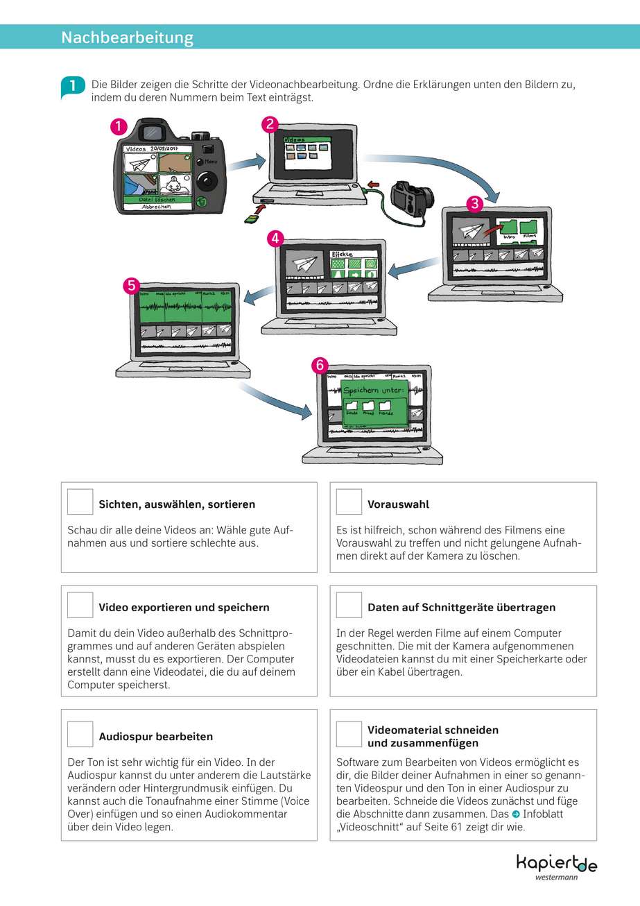 Auf diesem Arbeitsblatt werden Bilder zur Darstellung des Nachbearbeitungsprozesses eines Videos in der richtigen Reihenfolge Erklärungen zugeordnet. Dadurch wird den Schülerinnen und Schülern der Nachbearbeitungsprozess ihres eigenen Videos nähergebracht und Fachbegriffe erklärt.