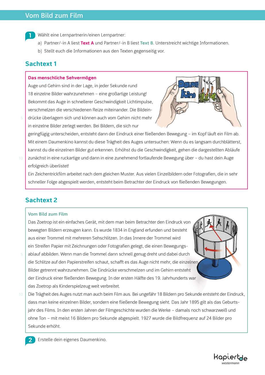Auf diesem Arbeitsblatt werden in Partnerarbeit Texte zum Thema „Vom Bild zum Film“ gelesen, die wichtigsten Informationen herausgestellt und untereinander ausgetauscht. Im Anschluss wird ein eigenes Daumenkino erstellt.