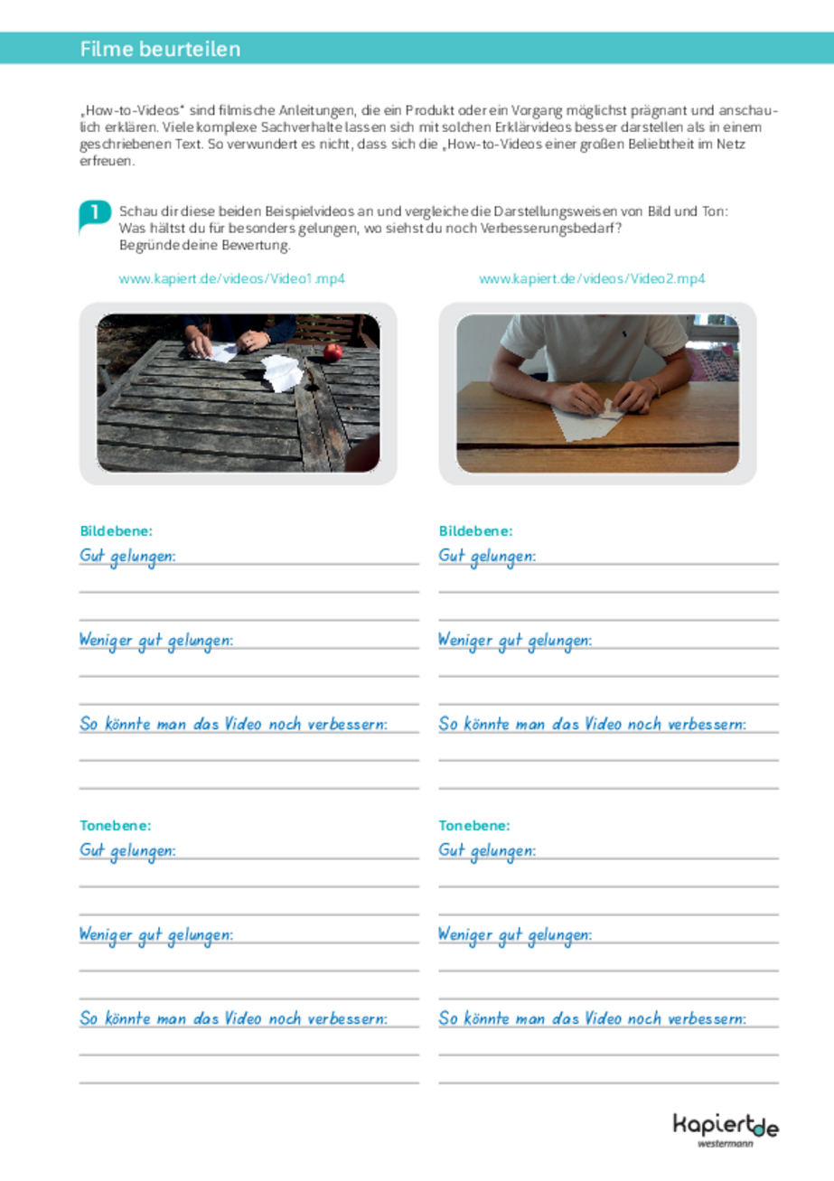 Auf diesem Arbeitsblatt beurteilen und vergleichen die Schülerinnen und Schüler anhand von Beispielen die Ton- und Bildebene von kurzen Videoclips. Zusätzlich erkennen sie an Bildern Probleme mit der Aufnahme und geben anschließend Tipps zur Verbesserung.