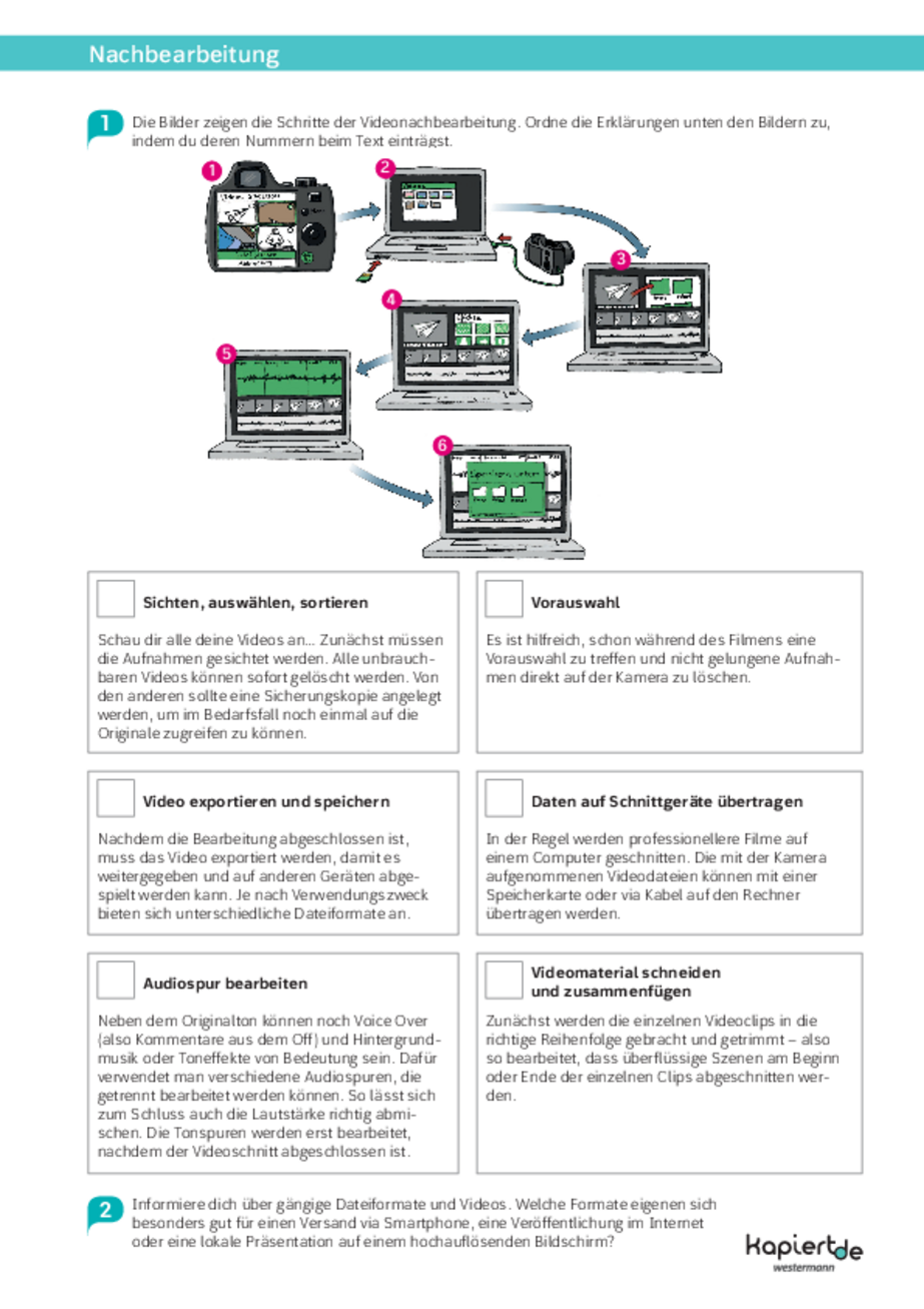 Auf diesem Arbeitsblatt werden Bilder zur Darstellung des Nachbearbeitungsprozesses eines Videos in der richtigen Reihenfolge Erklärungen zugeordnet. Dadurch wird den Schülerinnen und Schülern der Nachbearbeitungsprozess ihres eigenen Videos nähergebracht und Fachbegriffe erklärt. Sie informieren sich zusätzlich über gängige Dateiformate von Videos und deren Anwendungsgebiete.