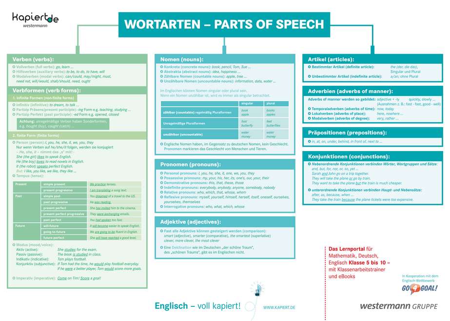 Du brauchst eine Übersicht zur Englisch-Grammatik? Hier findest du das Wichtigste über Verben und Verbformen, Nomen, Artikel, Adjektive und Pronomen aber auch zu den unflektierbaren Wortarten wie Adverbien, Präpositionen und Konjunktionen.