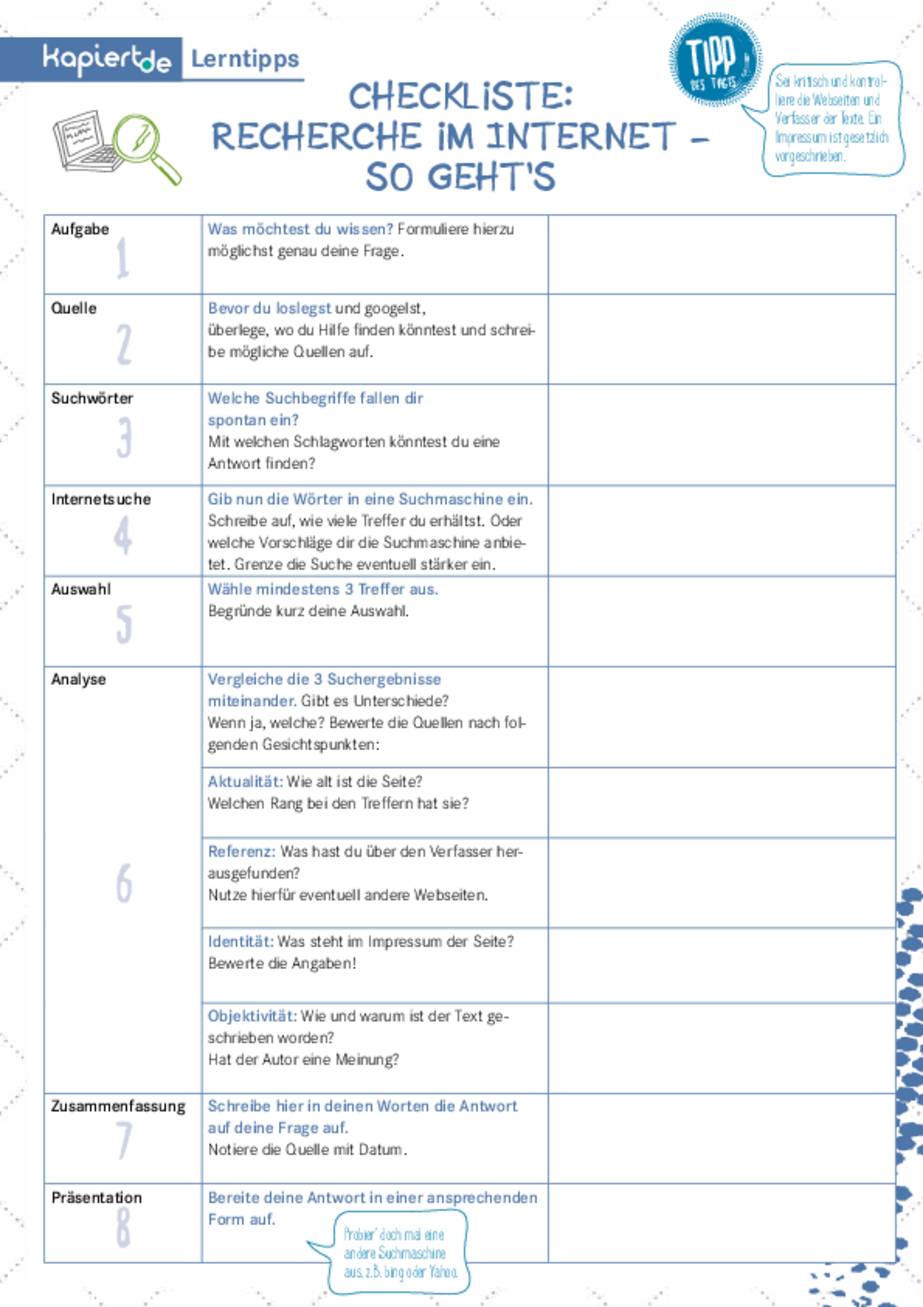 Eine Präsentation zu einem bestimmten Thema steht an, um diese perfekt zu meistern, möchtest du dir Infos aus dem Internet holen. Nun stehst du vor einem riesen Fragezeichen, weil du noch nie eine Internetrecherche gemacht hast. Dieses Fragezeichen können wir verschwinden lassen mit unserer Checkliste zur Internetrecherche. Wir haben für dich acht wichtige Punkte aufgelistet, die du nacheinander abarbeiten kannst: