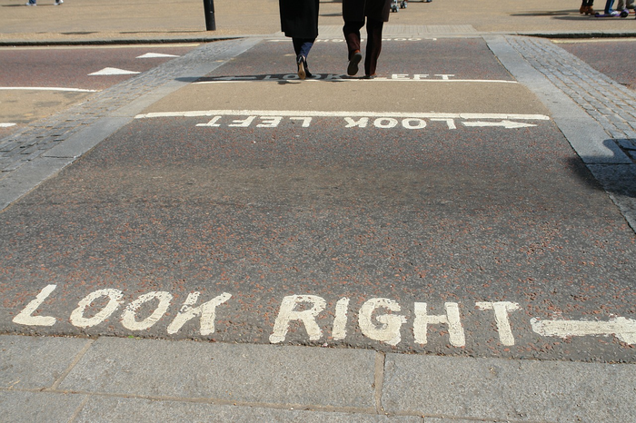 Besucher in London sehen oft automatisch in die falsche Richtung, wenn sie eine Straße überqueren möchten. Bei uns schaust du zuerst nach links, dann nach rechts. In Großbritannien ist es umgekehrt: Man muss zuerst nach rechts schauen, um zu prüfen, ob ein Auto kommt.