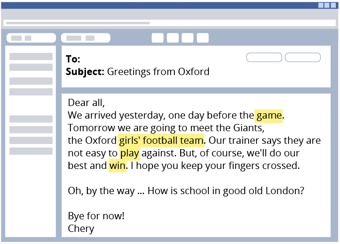 Hierbei helfen dir Schlüsselwörter weiter, wie zum Beispiel in dieser E-Mail: game, girls’ football team oder Verben wie play, win.