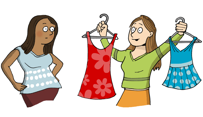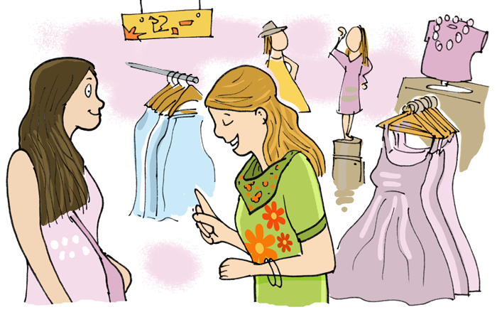 Melissa is attending a wedding next week and she asked her friend Johanna to help her find an outfit for the occasion. Melissa was looking for a long night dress. She found the perfect dress quite soon. The problem were the shoes. Fortunately, some hours and many shops later, the outfit was complete and they both went home happy. But Melissa had bought so much that Johanna had to help her friend carry the bags.
