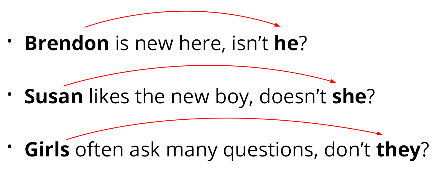 Eigennamen und Nomen aus dem Aussagesatz werden in der Bestätigungsfrage in das passende Personalpronomen umgewandelt.
