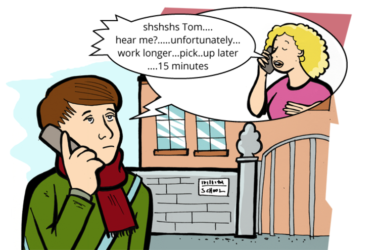 Tom wartet darauf, von seiner Mutter abgeholt zu werden als er einen Anruf von ihr erhält. Kannst du dir vorstellen, was sie ungefähr gesagt haben könnte?