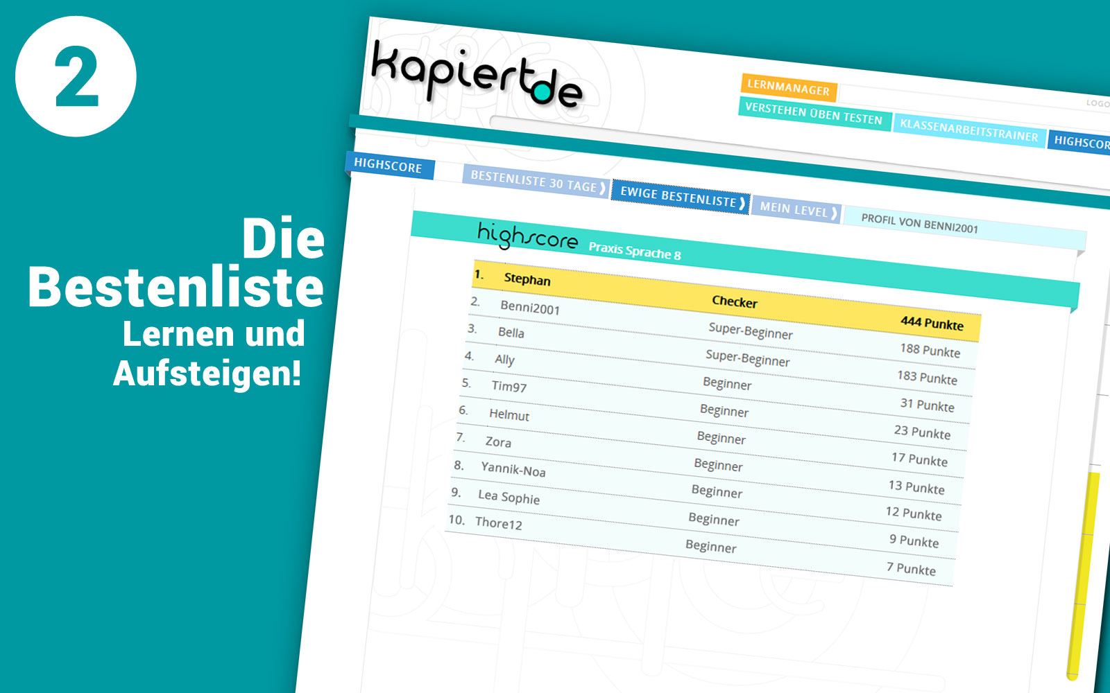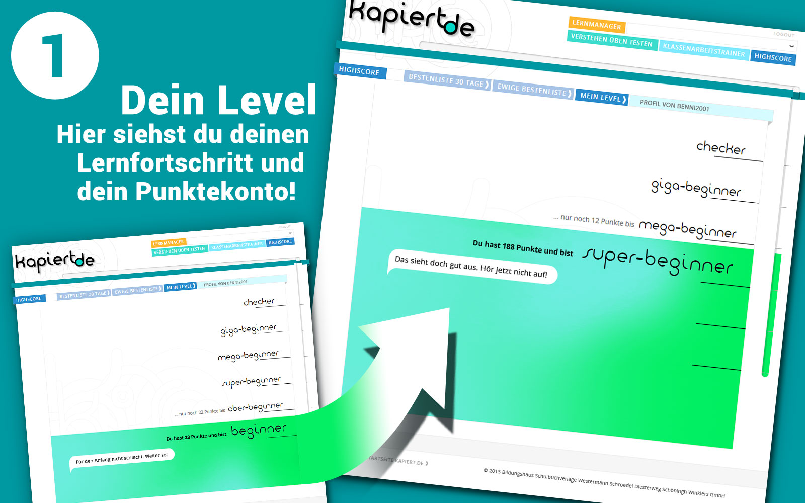 Mit deinem Lernfortschritt kletterst du Level für Level die Highscore-Liste hoch: vom „Beginner“ bis zum „Checker“.
