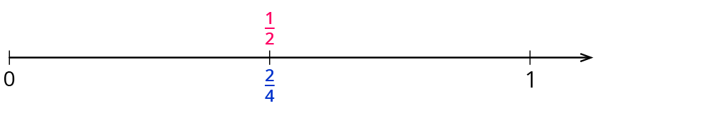 Die beiden Bruchzahlen liegen an exakt selben Stelle - klar, denn du könntest $$2/4$$ ja auch durch $$2$$ kürzen, und Kürzen verändert den Wert einer Zahl nicht!