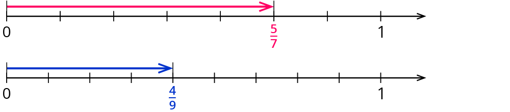 Im Beispiel ist $$5/7$$ größer als $$3,5/7=1/2$$, und $$4/9$$ ist ein bisschen kleiner $$4,5/9=1/2$$. Der erste Bruch ist also größer als als der zweite!