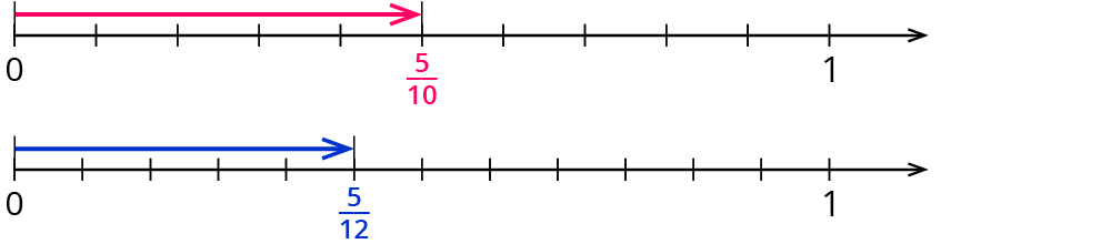Auf dem Zahlenstrahl liegt $$5/12$$ also weiter links als $$5/10$$.