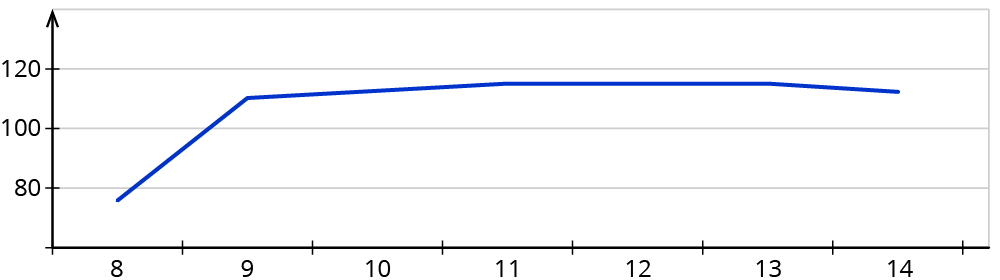 Die y-Achse ist gestaucht, ihr Maximum liegt jetzt bei einem höheren Wert. Der vordere Anstieg erscheint jetzt viel kleiner. Weiterhin wurde ein weiterer Wert hinzugefügt, so dass der zweite Anstieg noch viel stärker in den Vordergrund tritt.