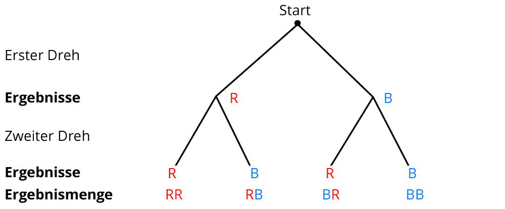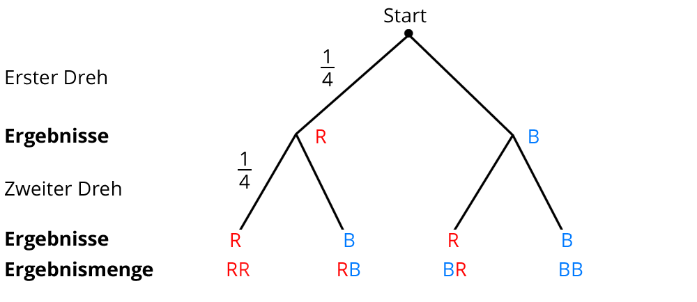 Wenn du ein ein Glücksrad zweimal hintereinander drehst, ist das ein zweistufiges Zufallsexperiment. Das kannst du gut in einem Baumdiagramm darstellen: