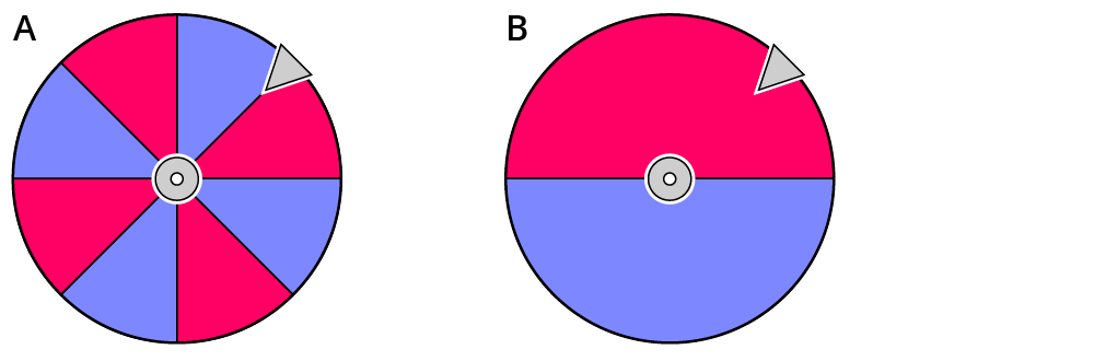 Das Glücksrad ist in 4 Felder geteilt. Die Wahrscheinlichkeit von rot ist $$1/4$$ und die Wahrscheinlichkeit von blau ist $$3/4$$.