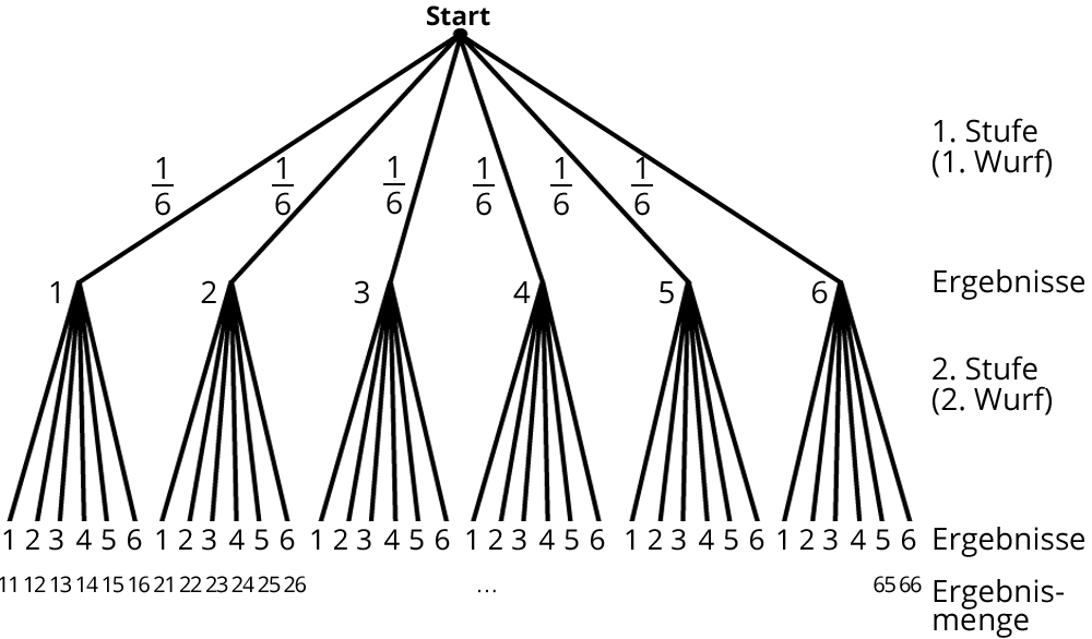 Ein Pfad endet bei einem Knoten. Dort beginnen die Pfade der zweiten Stufe. Auf der zweiten Stufe gibt es auch jeweils die 6 Ergebnisse.