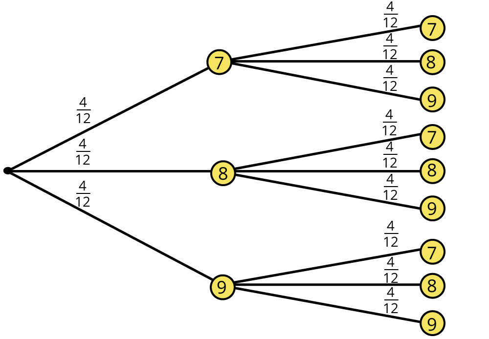Beim 2. Zug ist es genauso. Multipliziere beide Wahrscheinlichkeiten, die zum Ergebnis „78“ gehören: $$p = frac{4}{12}*frac{4}{12}=frac{1}{3}*frac{1}{3}=frac{1}{9$$.