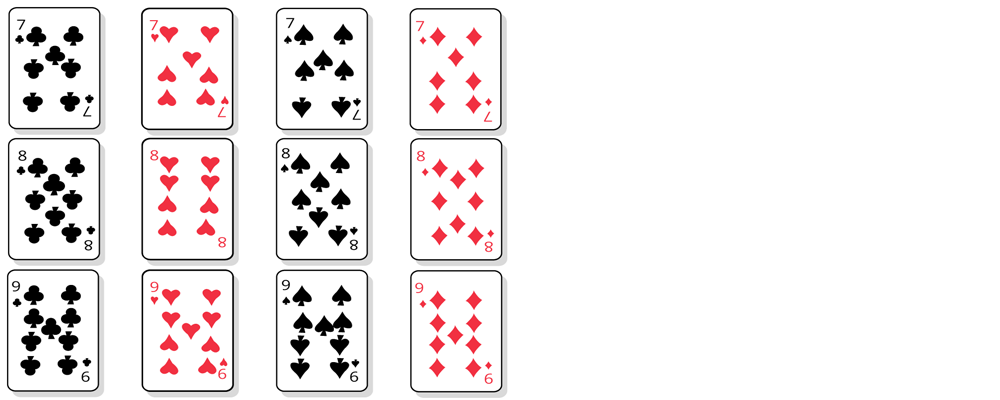 Nimm alle Luschen und ziehe daraus zwei Karten mit Zurücklegen. Die Farbe ist egal, notiere nur 7, 8 oder 9.