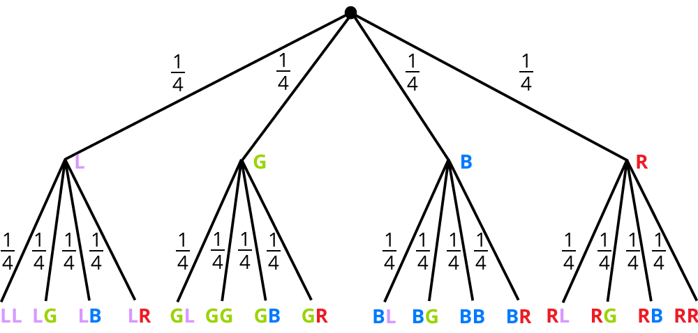 Die Wahrscheinlichkeit im ersten Zug „G“ zu erhalten, beträgt $$frac{1}{4}$$ und die für den zweiten Zug „L“ zu erhalten, ebenfalls $$frac{1}{4}$$. Multipliziere: $$p = 1/4*1/4=frac{1}{16}$$.