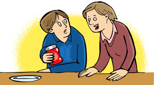 Felix isst für sein Leben gern Erdbeermarmelade. Beim Frühstück liest er seiner Mutter die Liste mit den Zutaten vor. Nach den Erdbeeren kommt der Zucker.