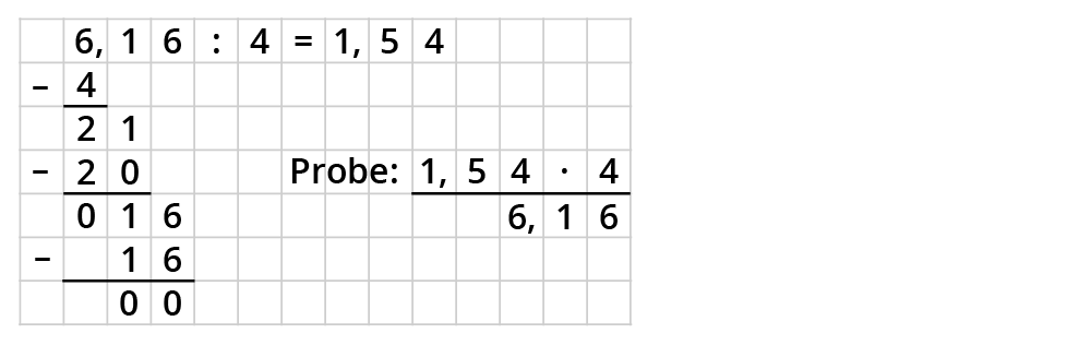 Für die Probe brauchst du die Multiplikation. Wenn du 2 Dezimalbrüche multiplizierst, hat das Ergebnis so viele Nachkommastellen wie beide Dezimalbrüche zusammen.