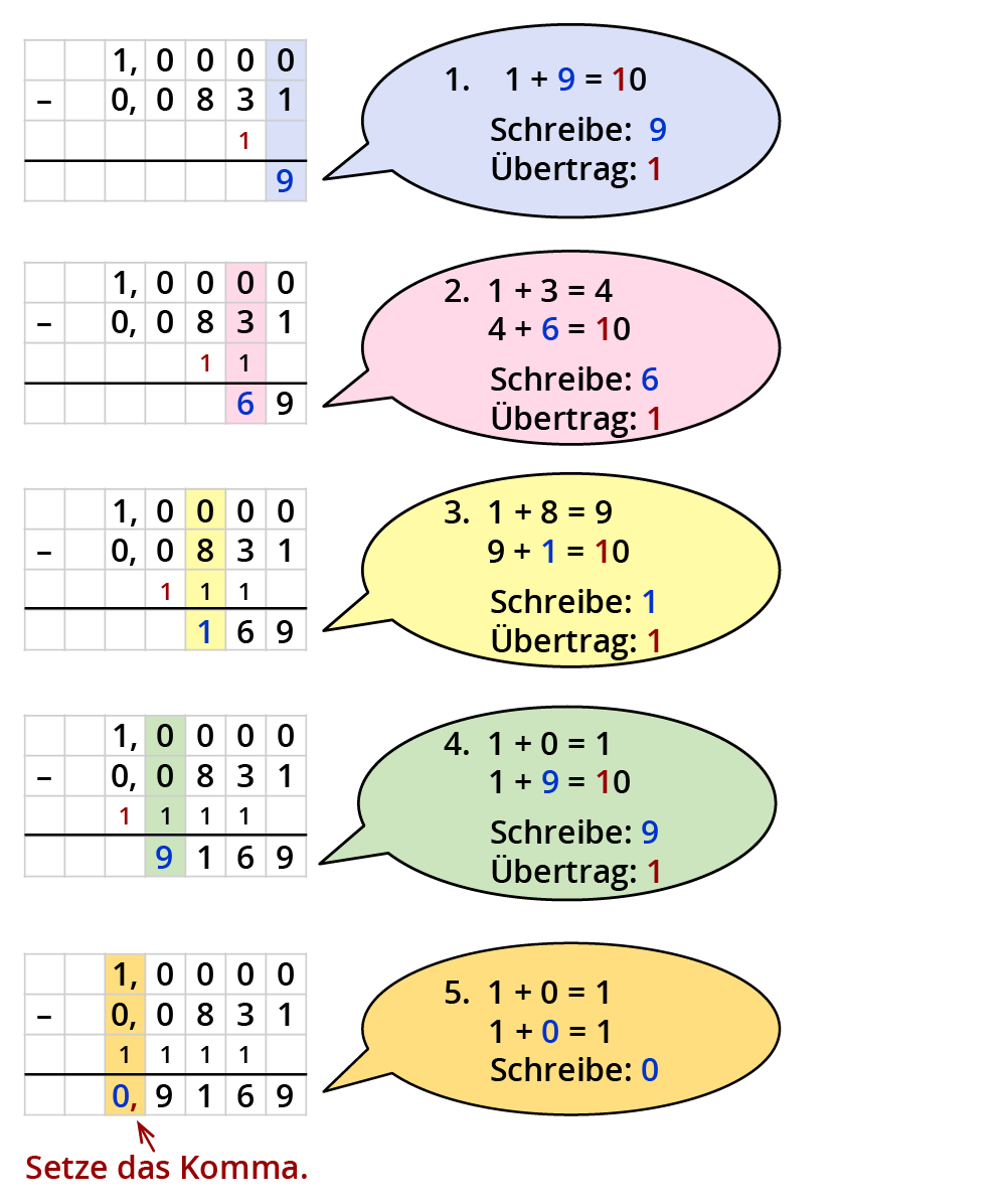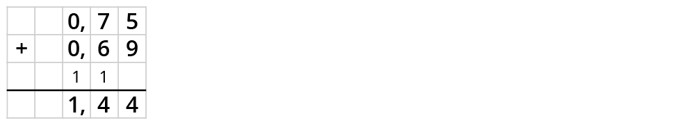 Schreibe die Dezimalbrüche so untereinander, dass Komma unter Komma steht. Das Komma im Ergebnis steht an der gleichen Stelle.