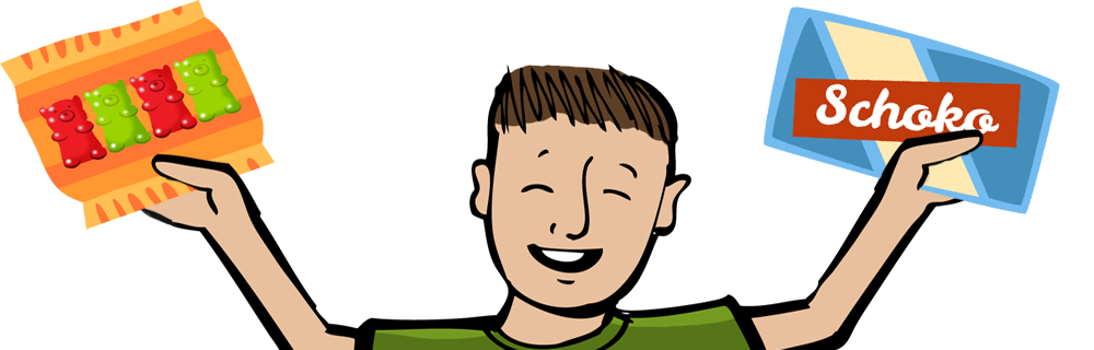 Du kaufst eine Tüte Gummibärchen und eine Tafel Schokolade.