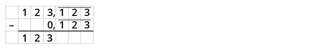 Von dieser Zahl kannst du $$0,\bar(123)$$ leicht abziehen. Bei beiden Zahlen wiederholen sich dieselben Ziffern hinter dem Komma unendlich oft.