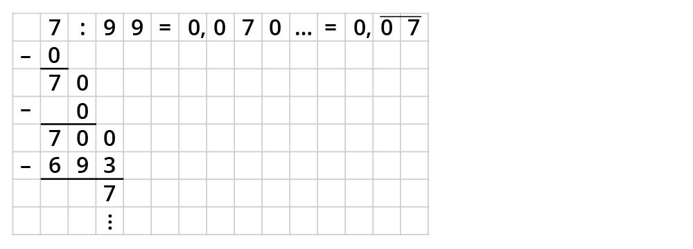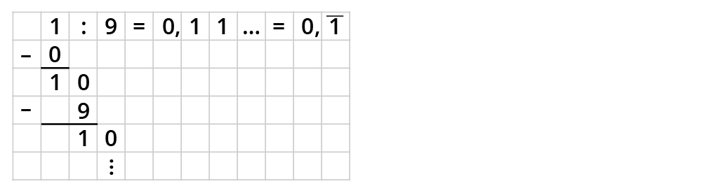 Wenn du Brüche umwandelst, deren Nenner aus Neunen besteht, stellst du fest, dass du den Zähler als Periode erhältst.
