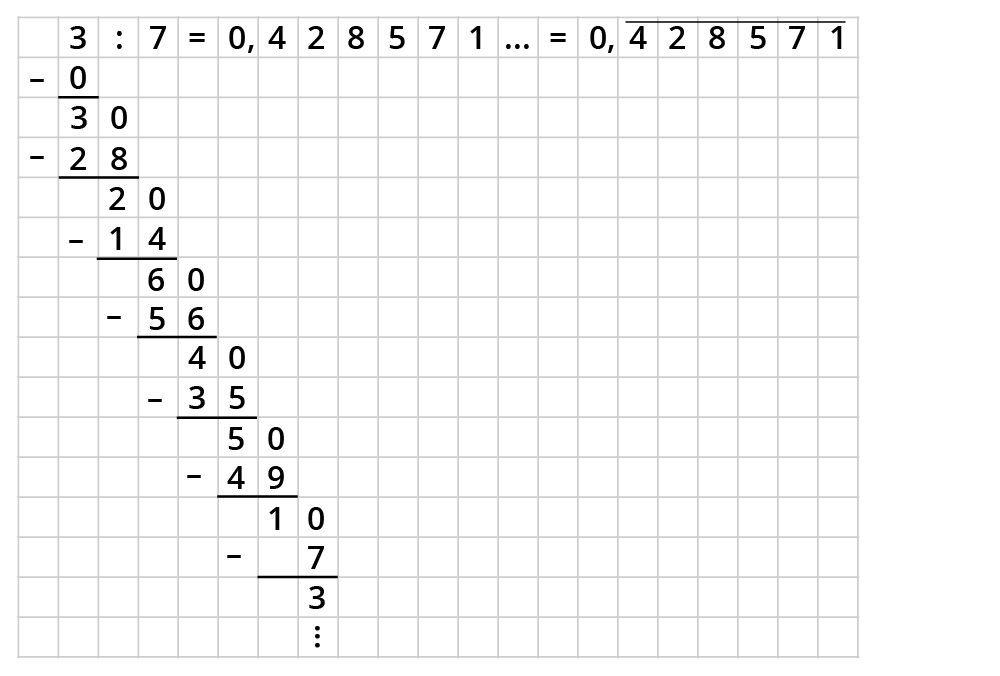 Alle sechs bei der Division durch $$7$$ möglichen Reste sind vorgekommen. Länger als sechs Stellen kann die Periode der zu $$3/7$$ gehörigen Kommazahl nicht sein.