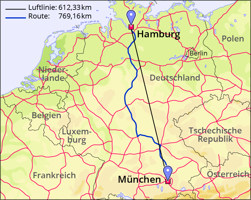 Eine Maps-App zeigt dir die kürzeste Wegstrecke zwischen 2 Städten, die du mit einem Auto fahren würdest. Das ist die blaue Linie in der Karte.